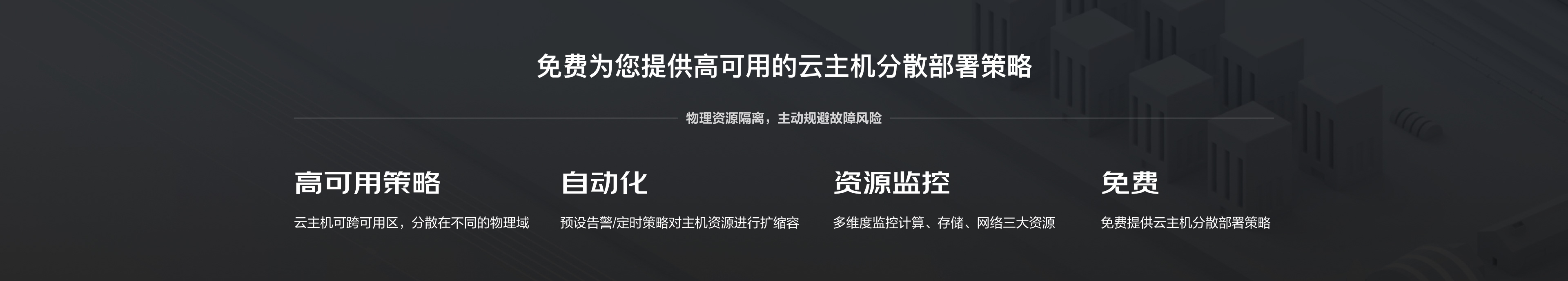 当您选择在高可用组内部署云主机时,您的云主机将被分散在多个可用区的不同物理资源上,相互隔离。一旦发生底层硬件/软件故障时,影响会控制在该资源上的云主机内,其他云主机正常可用,保障您的业务稳定运行。